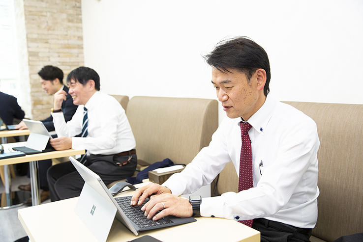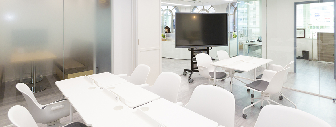 リモートでも対面でも可能な広い研修室が備えてあります。フロントオフィスでも商談、会議、研修が可能です。
