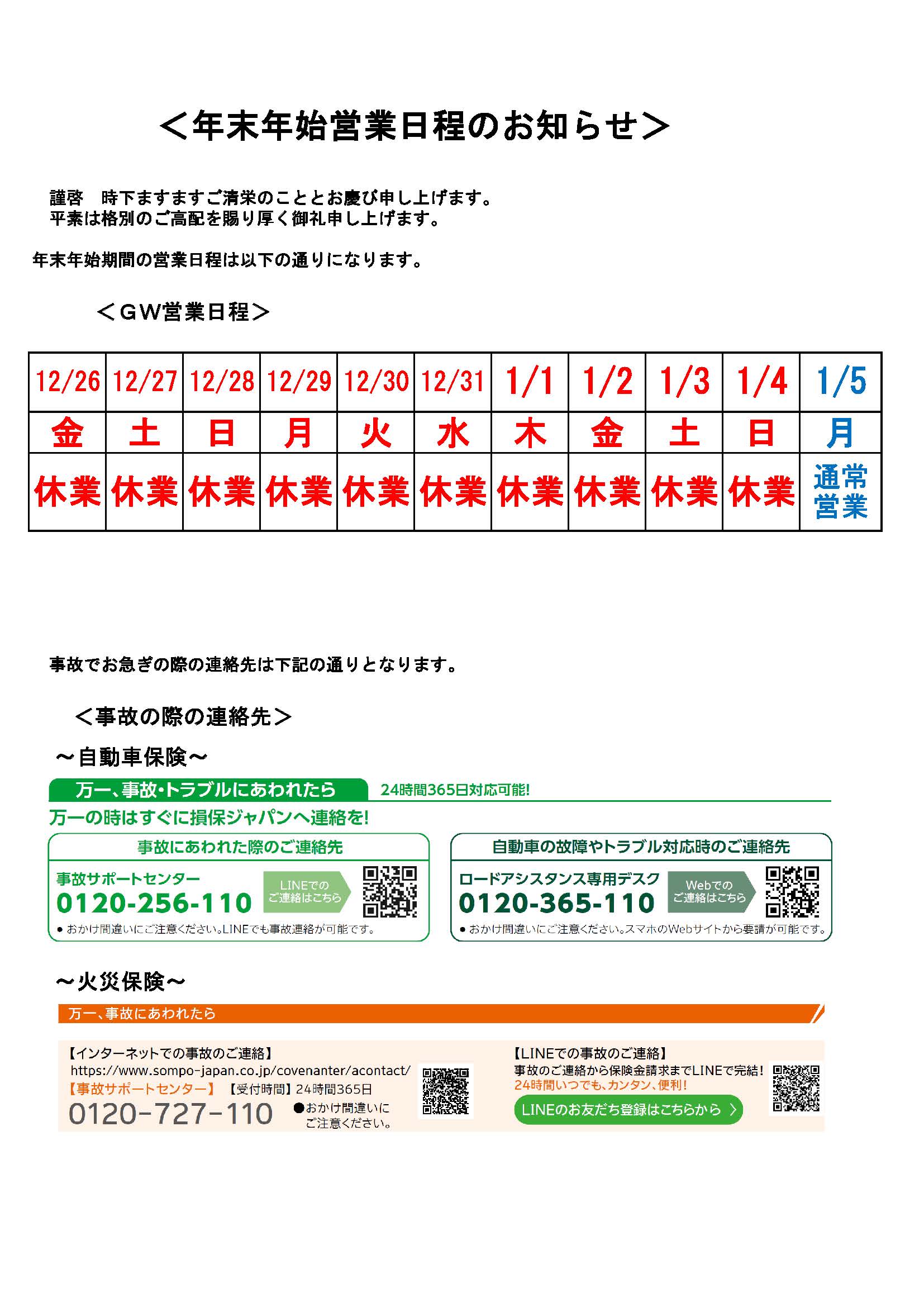 年末年始の営業日程のご案内になります。
