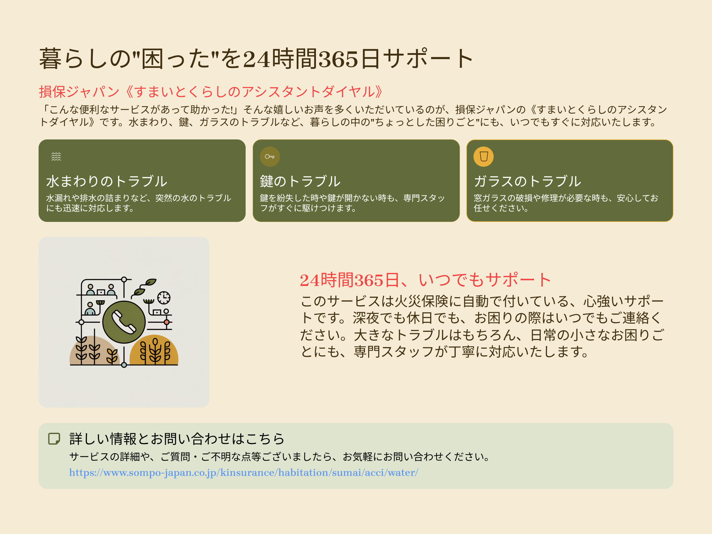 2025年10月のアクシアークからの情報提供です。今回は、火災保険に自動付帯されております「すまいとくらしのアシスタントダイヤル」のご紹介です。お困りの際には是非ご活用ください。